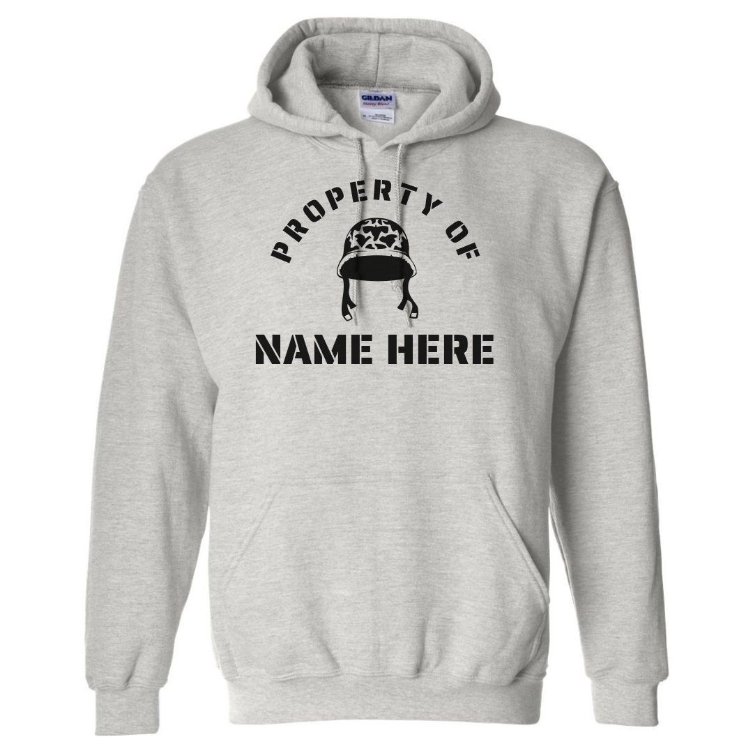 Support your husband in the armed forces with your very own customizable hoodie! Add his name and maybe his rank too. Or you know what? You can make it say - literally - whatever you want. The ball is in your court, as they say. This design features a military banner in the middle with a big star and bars to either side. Military iconography for military wives.