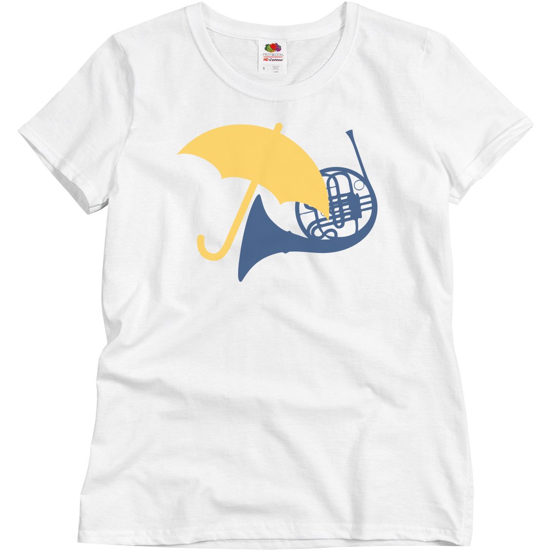 A cute yellow umbrella and a blue french horn make up this unique custom design inspired by a TV show.
