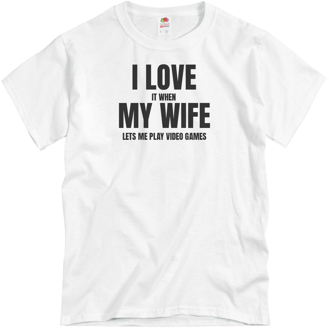 I love my wife! Wait no.. look again. OHH that makes more sense! I love it when my wife lets me play video games. HA! Get dad a funny fathers day gift with this I love my wife t-shirt. Mom and dad will both get a kick out of this one.