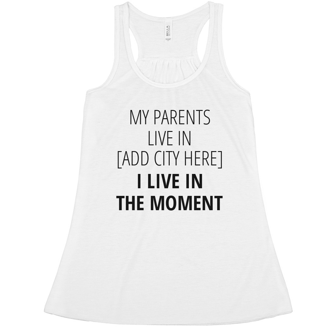 My parents live in Ohio. I live in the moment. This is what I say when people accuse me of exaggerating my origin story. Maybe sometimes I imply that I am from a high class east coast upbringing, and then someone points out, hey aren't you from Ohio? To which I would say: my parents live in Ohio. I live in the moment. In fact, I believe it so much I wear a t-shirt to explain it up front.