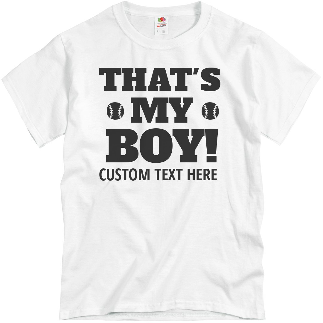 That's my boy! Show how proud you are of your baseball player by wearing this tee to all of his games! This is the perfect dad t-shirt to customize with your son's name or his team name. Get out there and cheer loud!