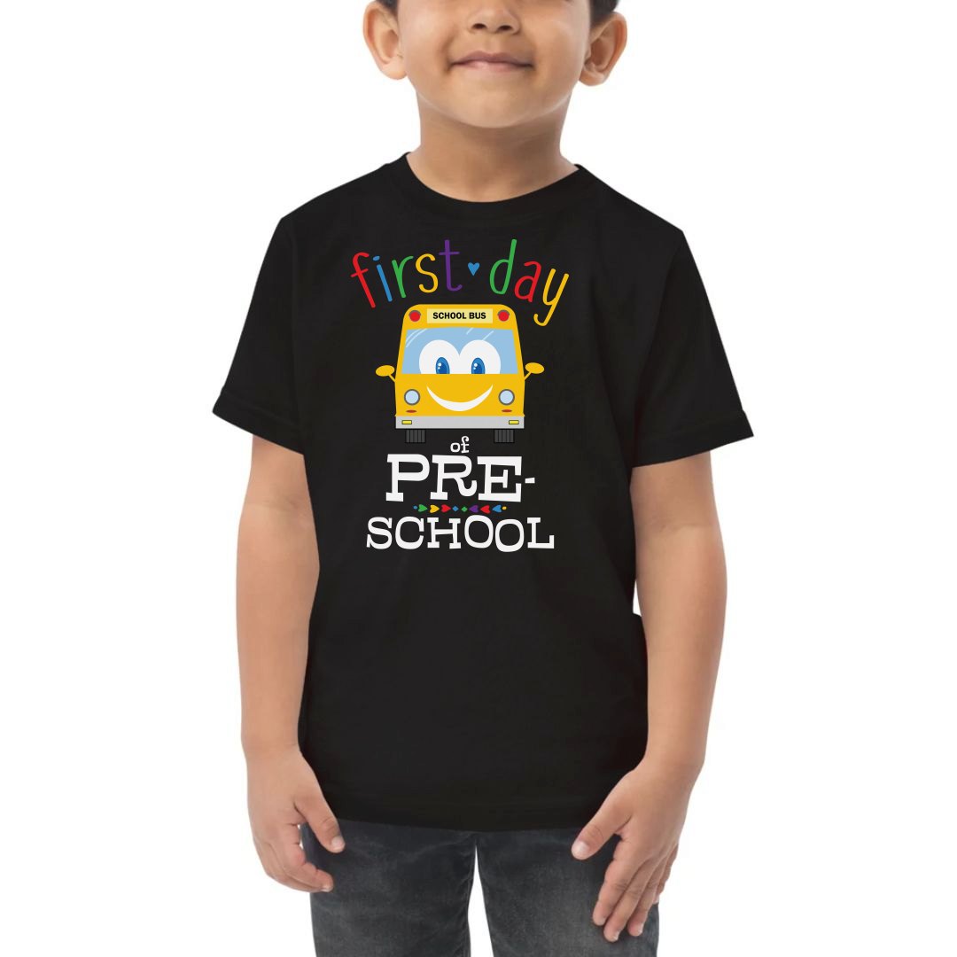Super cute smiling school bus that says first day of preschool. Great back to school gift for pre-school elementary students or teachers.