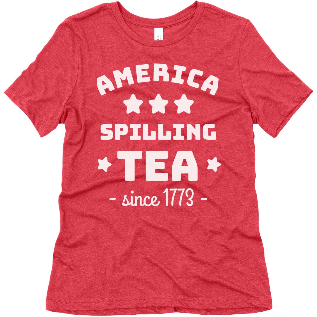 America: spilling tea since 1773. Rock this hilariously festive t-shirt for the Fourth of July this year. Celebrate the red, white, & blue in a funny way. America has always been good at spilling tea - literally and figuratively.