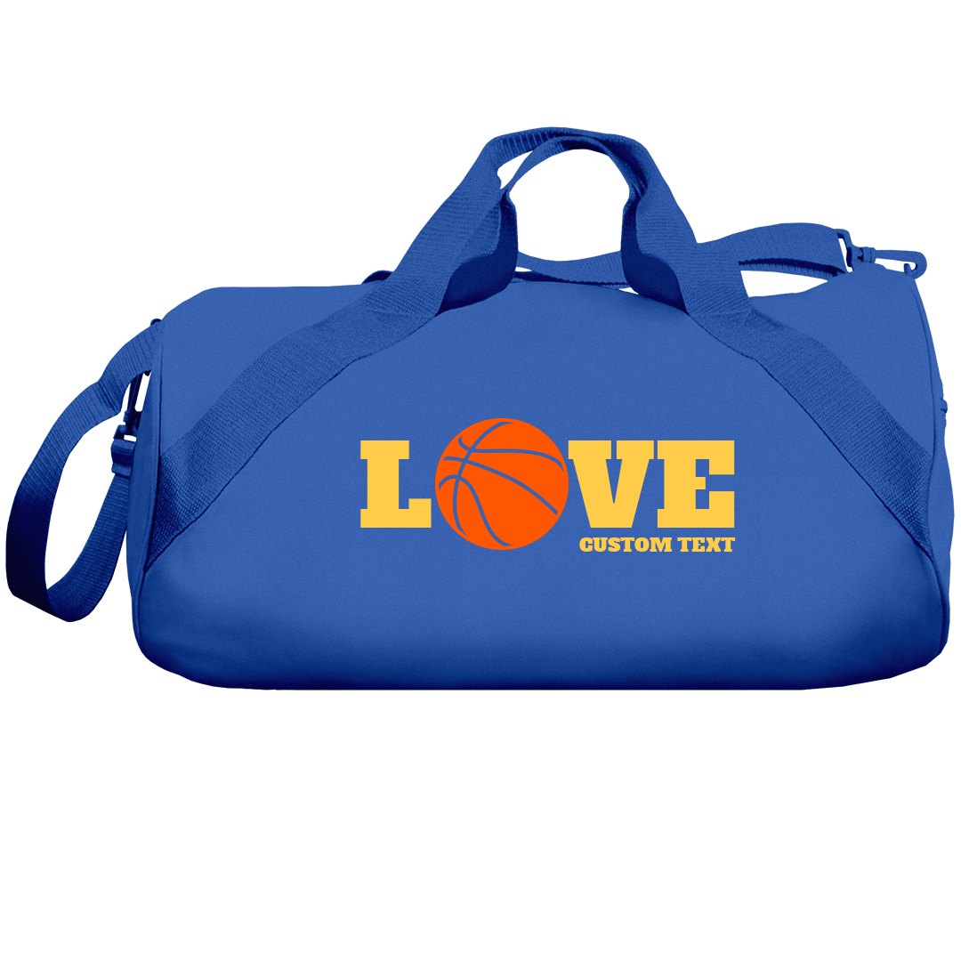 Customize this basketball love duffel bag with your own text. Personalize it with your school, team, or name of your choice.