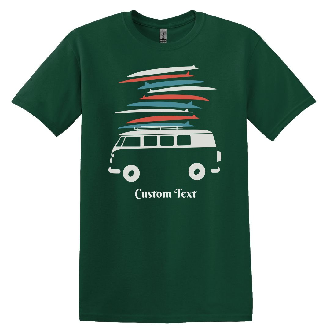 Create your own surf shop style t-shirt. This retro surf van and surfboard design is perfect for bumming around in or staying cool at the pool or beach.